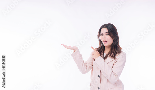 Excited asian mixed race businesswomen use finger pointing copy space on hand smiling face standing on isolated white background.Cheerful young girl wear suit finger pointing present or show something