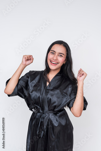 Excited asian woman in black silk bathrobe on white background