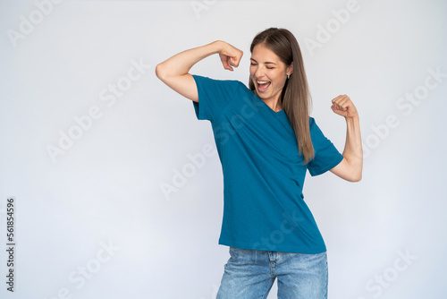 Excited Caucasian woman dancing with raised arms. Joyful young female model with brown hair in blue T-shirt with closed eyes laughing, showing biceps. Optimism, success concept