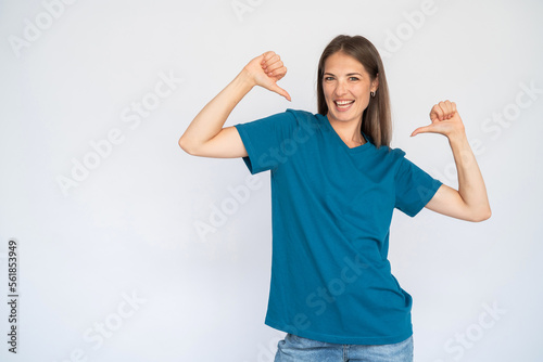 Excited Caucasian woman pointing thumbs at herself. Portrait of cheerful young female model with brown hair in blue T-shirt looking at camera, smiling and laughing. Self-assurance, success concept