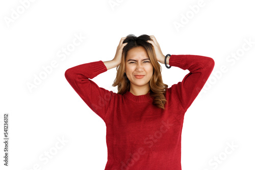 Excited confident asian happy woman in winter sweater red color isolated on white background. not satisfied