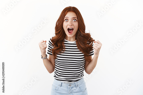 Excited emotive and thrilled gorgeous redhead girl in striped t-shirt, stare camera surprised and amazed, gasping drop jaw fantastic news, fist pump, triumphing, achieve success, win prize