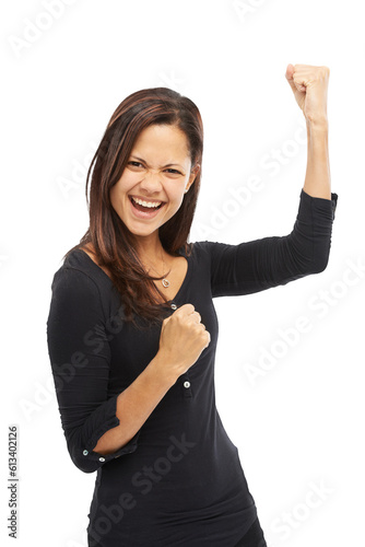 Excited, fist pump and celebration, woman in portrait with reaction to announcement isolated on transparent png background. Winning, happiness and cheers, female person with success and achievement