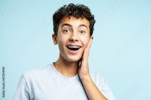Excited handsome teenage boy wearing dental braces touching face looking at camera
