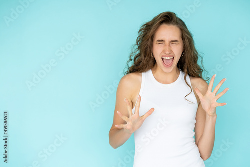 Excited happiness. Expressive woman. Winner success. Pretty emotional screaming lady hands up closing eyes isolated blue copy space.