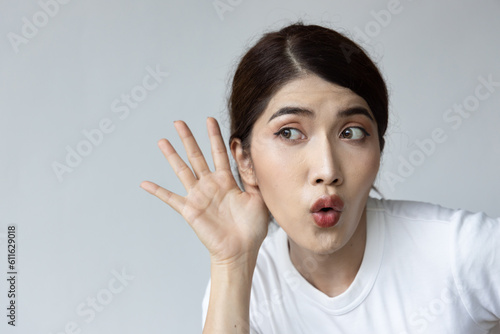 Excited happy woman listening to something, portrait of asian woman with hearing ear, concept of good rumor, gossip, hard of hearing treatment, fake news immunity, good news