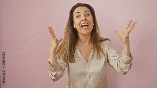 Excited hispanic woman gestures emphatically against a pink wall, portraying emotion and liveliness.