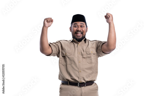 excited male worker wearing brown uniform raised his arm. pegawai negeri sipil indonesian government employees