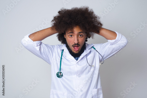 Excited overjoyed doctor man screams after receiving good news, keeps hands on head, can't believe it.
