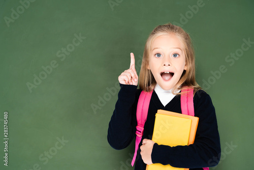excited schoolgirl holding book and showing idea gesture while standing near green chalk board