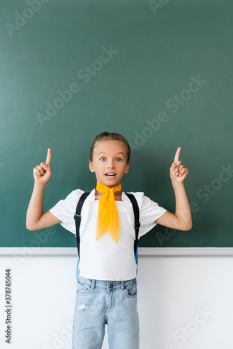 Excited schoolgirl with backpack pointing with fingers at chalkboard
