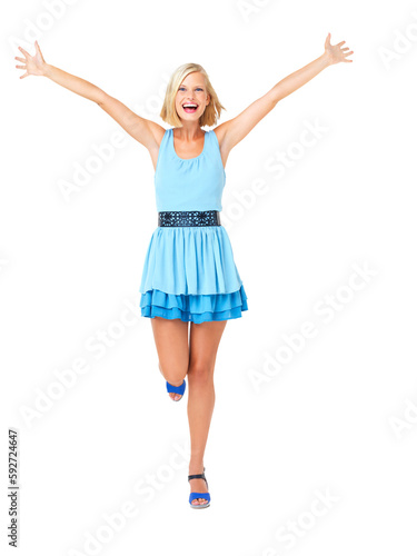 Excited, surprise and freedom with portrait of woman with celebration, motivation and fun. Freedom, wow and smile of a happy model girl with confidence and isolated on a transparent, png background