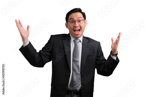 Excited young Asian businessman in black suit celebrating success with hands raised isolated on transparent background