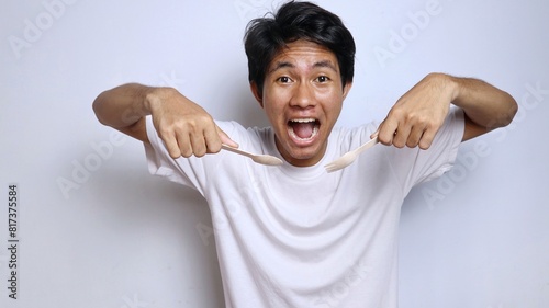 Excited young Asian man in white shirt gestures while eating holding spoon and fork made of bamboo