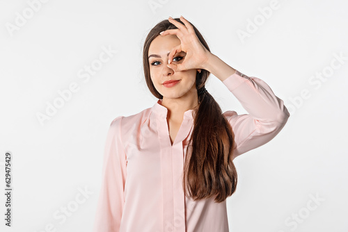 Excited young brunette woman is looking at camera, showing Ok sign and smiled, eye looking through fingers with happy face, standing against white studio background