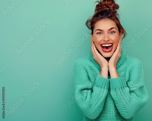 Excited Young Woman Expressing Joy with Hands on Face, Against Green Background - Perfect for Lifestyle or Happiness Themes