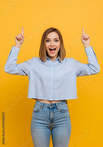 Excited young woman pointing upwards happy expression bright yellow background studio shot amazed girl positive emotion joyful surprised look advertisement