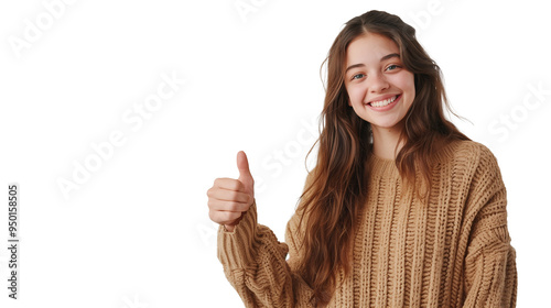 Excited young woman showing banner, pointing fingers left and smiling at camera, standing amazed on transparent