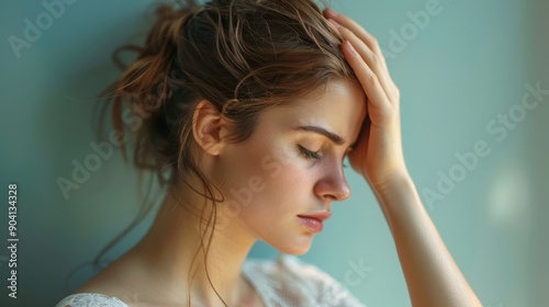 Exhausted woman in profile holding head, overwhelmed and stressed with mental health issues
