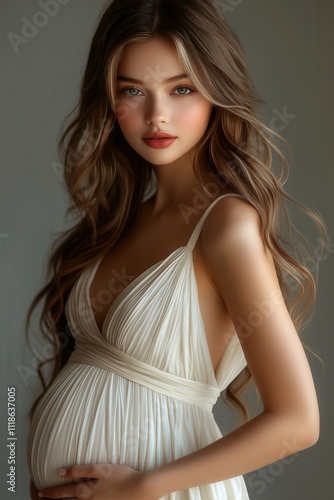 Expecting mother in elegant dress poses gracefully, showcasing maternal beauty and connection during a serene indoor setting