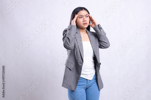 expression of beautiful adult office woman dizzy both hands hold head tilted left wearing gray suit standing isolated on white background. for health, medical, commercial, prevention content