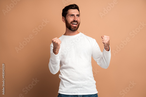 Extremely excited overjoyed man with beard making yes gesture, amazed with his victory, triumph. Indoor studio shot isolated on beige background