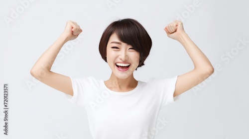 Exuberant girl raises her hand in a gesture of peak happiness, radiating a sense of relaxation and pure joy. Generative AI.