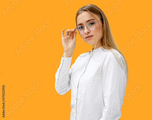Eyeglasses closeup. Woman in spectacles. Choosing glasses. Client in optics. Selective focus. Woman in corrective glasses looking to the camera. Stand with spectacles. Wide assortment in shop.