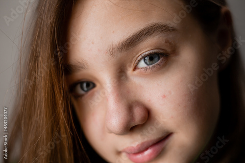 Face of a teenage girl in close up. Teen with problematic skin. Girl with a square hairstyle. Acne and scars. Natural portrait. No makeup and retouch. High quality photo