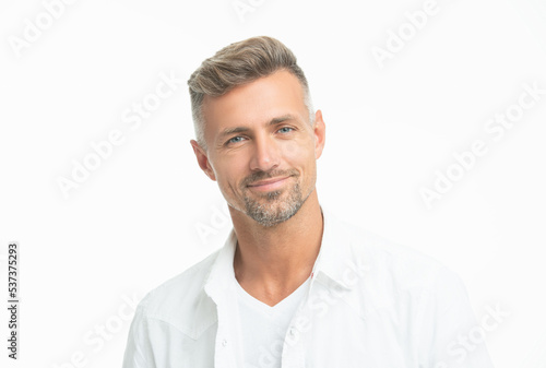 face of unshaven man smile in white shirt. portrait of unshaven man style. studio shot