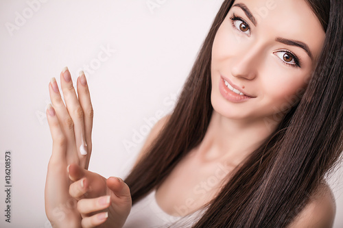 Face Treatment. Woman in Beauty Salon. Applying cosmetic cream. A beautiful young woman applying face moisturizer. Scine care of the face and hands