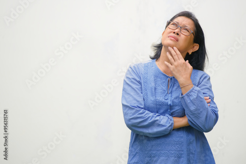 Facial expression of an elderly Asian woman standing and thinking hard about something