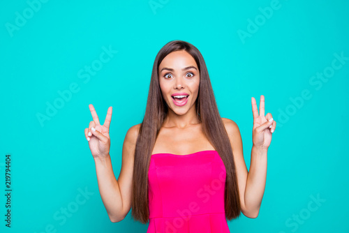 Facial reaction expressing concept. Close up studio photo portrait of funky sweet impressed charming rejoicing delightful pretty lady making v-sign open mouth isolated vivid bright shinny background
