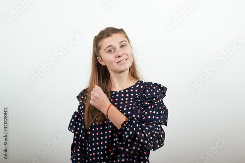 Fair-haired beautiful girl in a black dress with white circles stylish cool woman posing