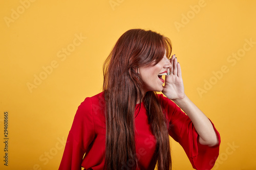 Fantastic girl covers her mouth with one opened hand. Young woman looks as if she wants to tell good, happy and nice words. Long, shining hair attracts people.
