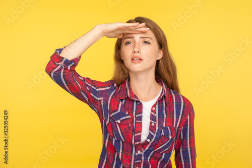Far away view. Portrait of cute ginger girl in checkered shirt holding hand over forehead and looking at long distance, positive perspectives and future. studio shot isolated on yellow background