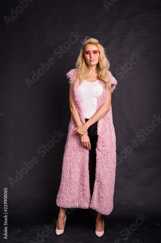Fashion and people concept - young blonde woman in glasses standing in pink fur coat and smiling
