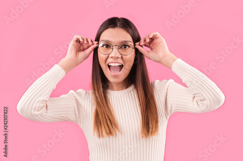 Fashion brunette smiling woman wearing beige jacket keep round glasses on pink background
