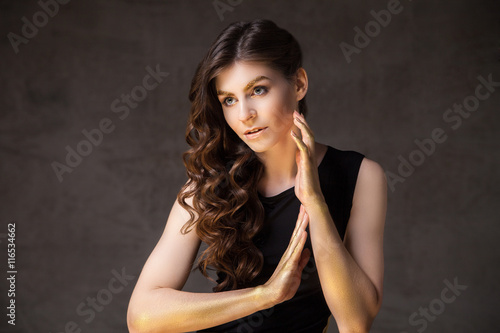 Fashion brunette with long wavy hair looking away