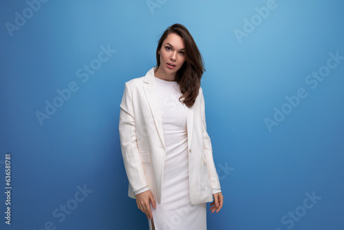 fashion business young lady in white dress and jacket posing on studio background with copyspace