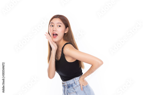 Fashion of a beautiful young asian woman in a pretty black vest and blue jeans feeling smile and happy. isolated on white background. Summer fashion beauty and style.