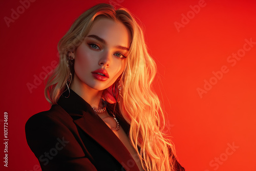 Fashion shooting in studio . Professional model of blonde, fashionable clothes and style, new collection. stylish look.
