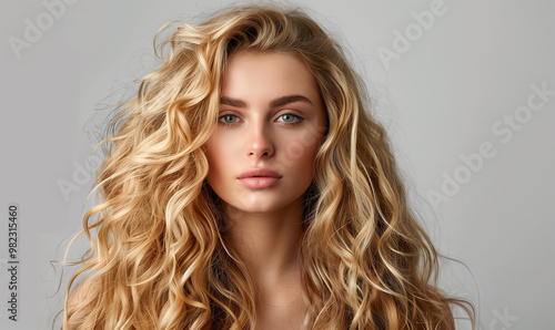 Fashionable beauty fashion model with make-up, clear skin and blond long shiny wavy hairstyle. Hair care, coiffure and cosmetic concept