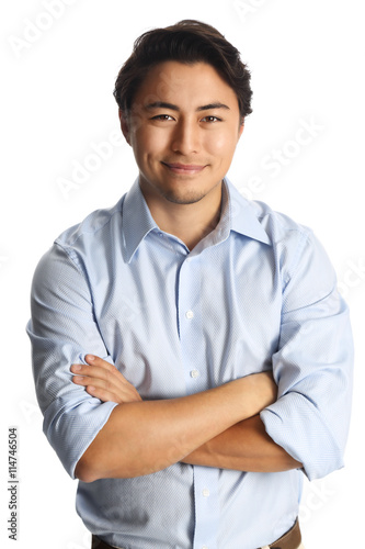 Fashionable man wearing a light blue shirt, standing with his arms crossed against a white background.