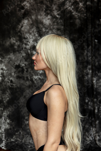Fashionable photo of young blonde woman wearing black lingerie