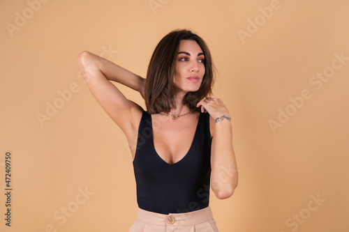 Fashionable portrait of a young woman on a beige background in a black bodysuit and trousers with gold cuts, a chain, a ring, posing