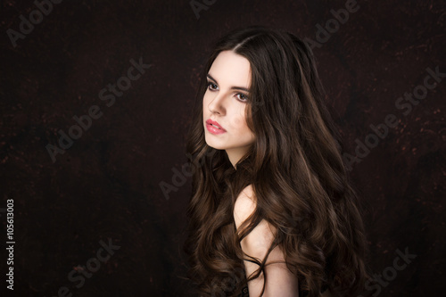 Fashionable portrait woman with long healthy shiny hair on a dark background.