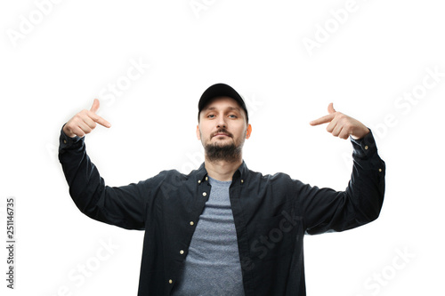 Fashionable white man with beard and cap points to himself.