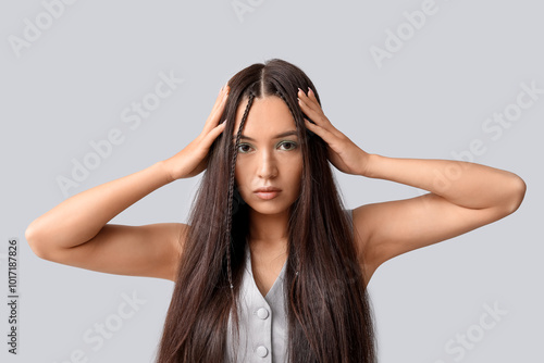 Fashionable young Asian woman with stylish mint makeup on grey background