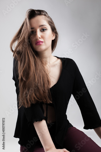 Fashionable young woman in black top, striking a casual pose with flowing hair